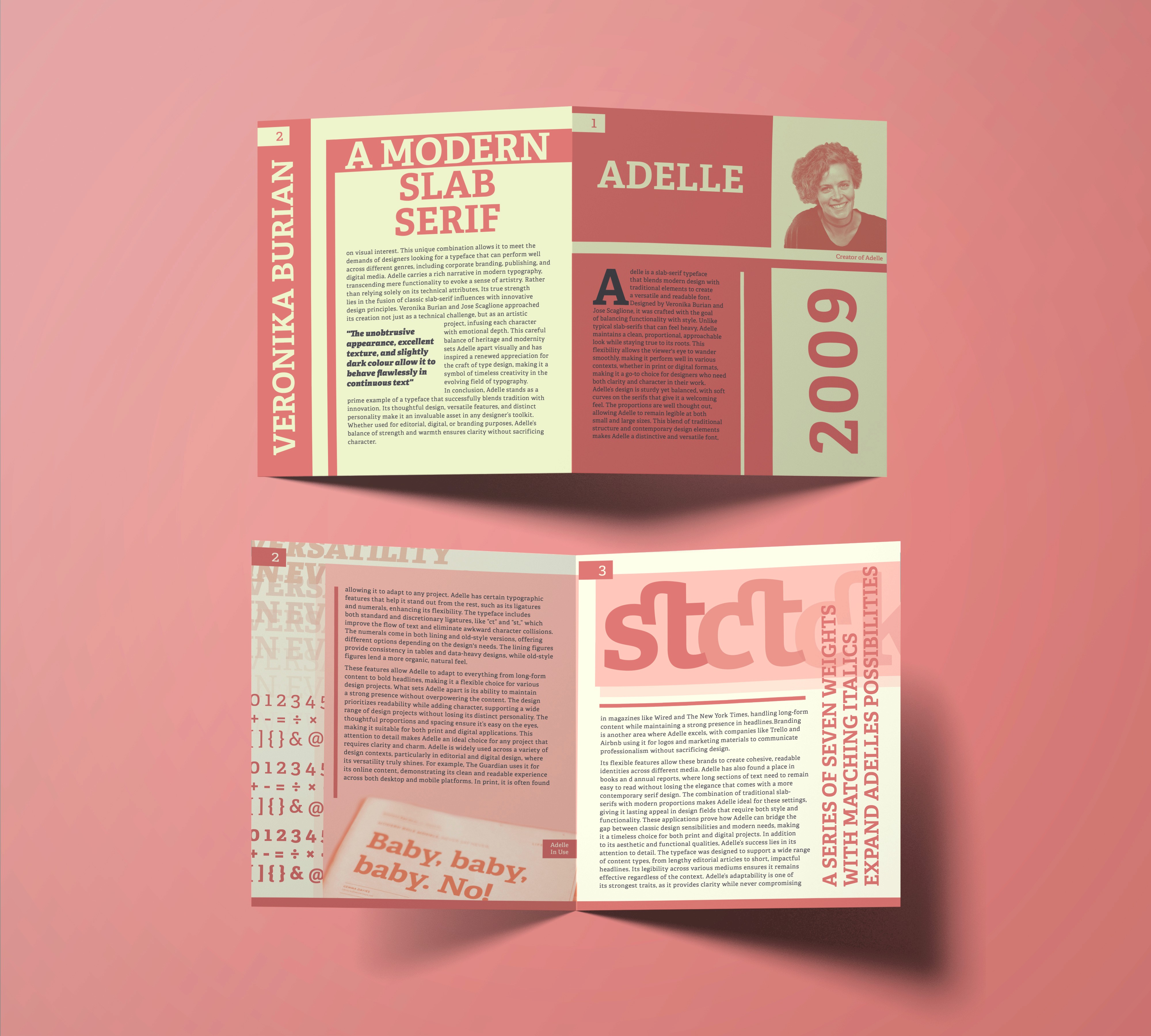 A typography class study of Adelle through black-and-white and color editorial layouts.