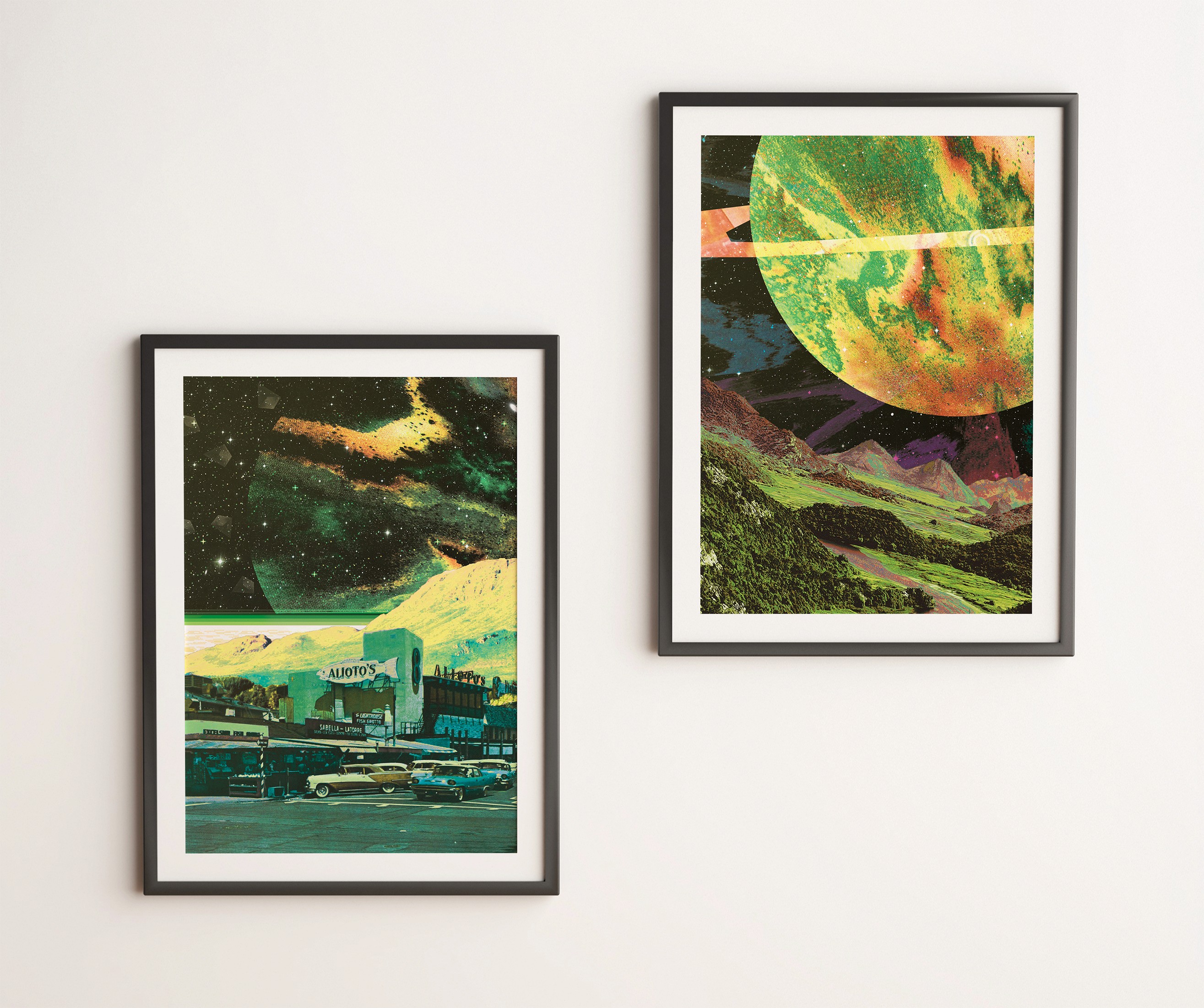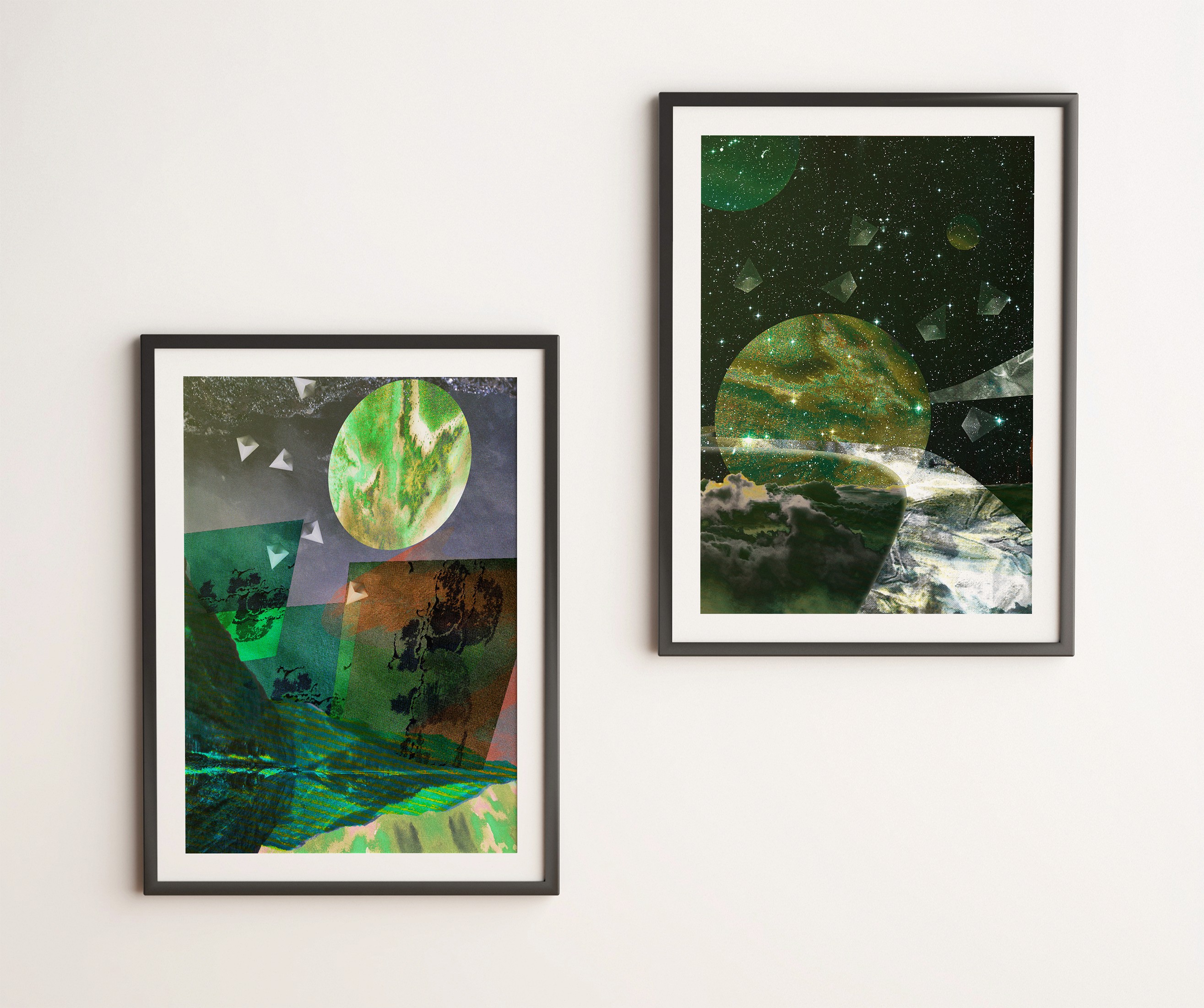 Three space-themed digital collages built from scanned media and composed to tell a visual story.
