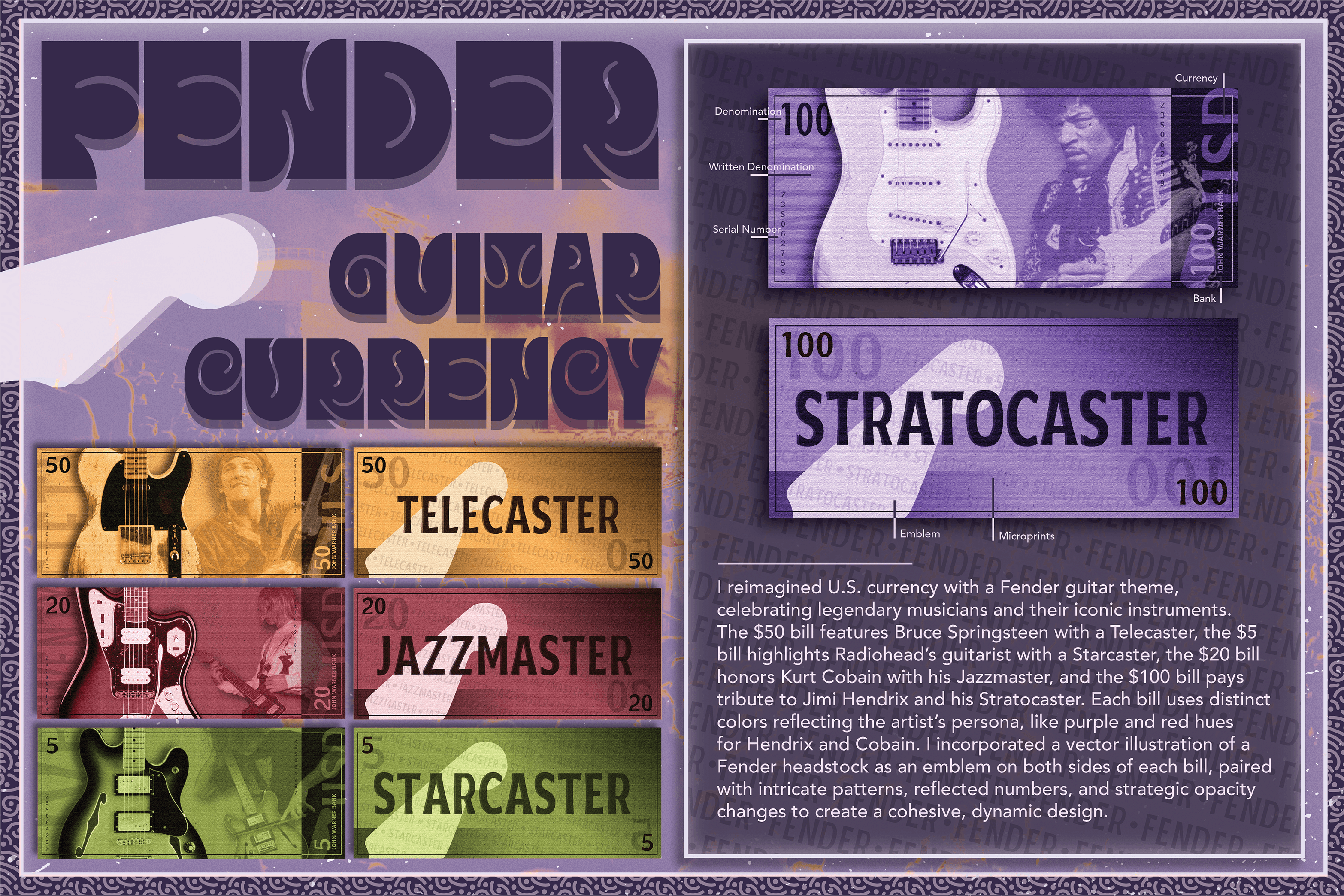 This project reimagined U.S. currency through the visual language of Fender and guitar culture, turning each bill into part of a full themed note system. I designed a complete set of bills and a poster, building in details like microprint, emblems, serial numbers, and portraits of well-known musicians to make the concept feel collectible while still grounded in real currency structure. The work was created in Illustrator and focused on balancing expressive music references with the precision and hierarchy that make banknote design feel believable.