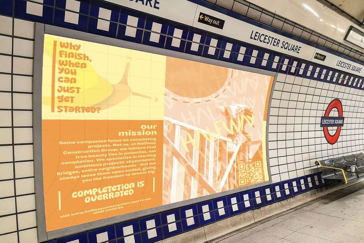 Halfway Construction was a full brand development project that expanded into a website concept and advertisement system. The branding was intentionally satirical and far less corporate than the kind of design I usually make, which made it a fun chance to push a louder and less expected visual direction. I created the logo, posters, packaging, video and social ads, and a landing-page concept in Figma, using After Effects and Illustrator to build a brand system that could carry the joke while still feeling cohesive across print, motion, and digital touchpoints.