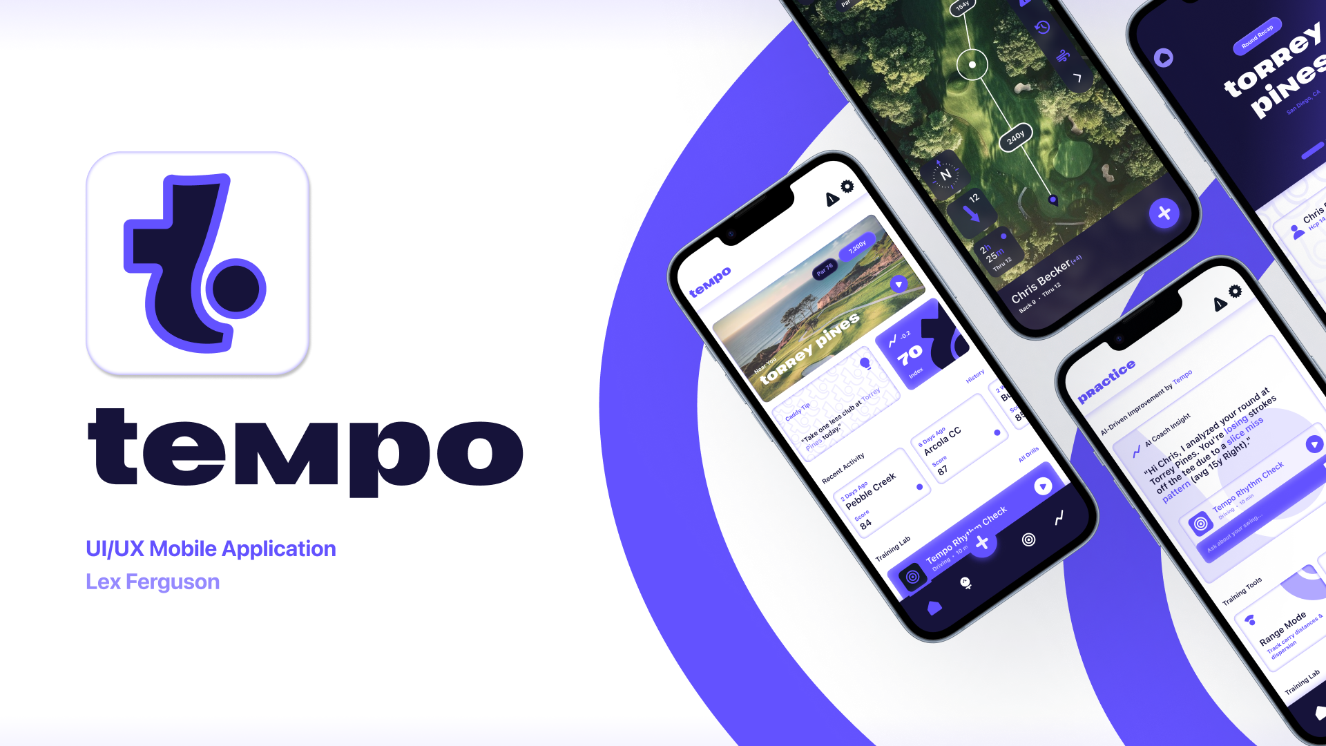 I designed Tempo as a premium on-course companion that brings the feel of an AI caddy to a mobile app, built primarily for casual golfers but useful for more serious players as well. The concept combines club suggestions, shot planning, course strategy, weather insight, swing feedback, score tracking, and AR shot-path visualization into one focused experience that helps players make smarter decisions throughout a round. This was a UI and concept project, so I handled the brand identity, visual guidelines, concept direction, and advanced prototyping in Figma and Illustrator rather than development.