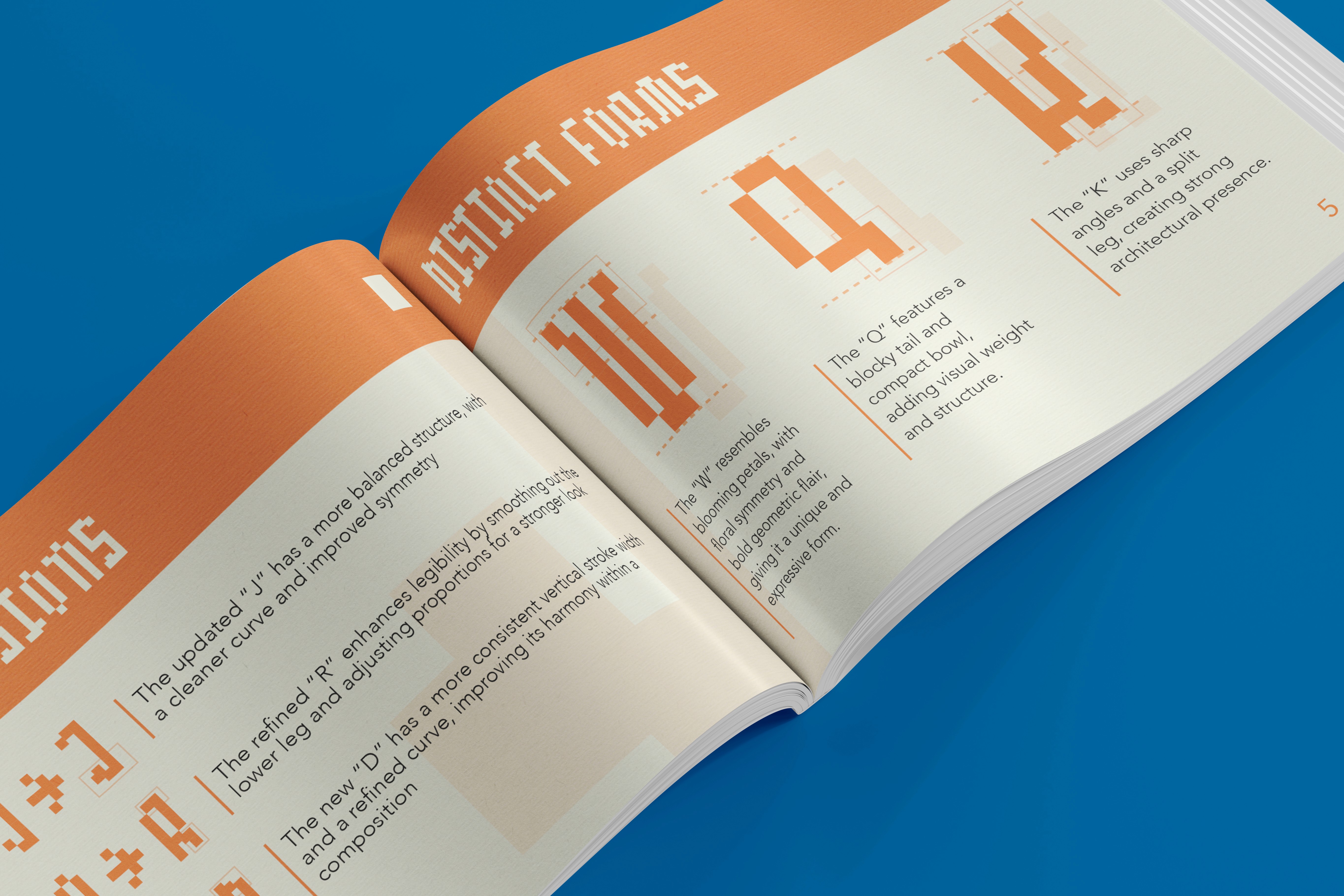 A modular typeface created for class and applied across a poster and editorial book layout.
